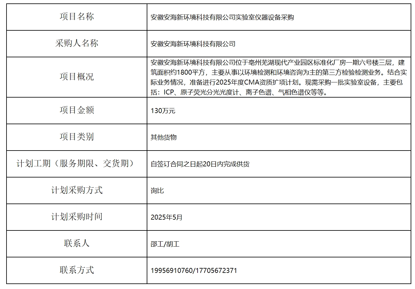 安徽安海新環(huán)境科技有限公司實驗室儀器設備采購計劃