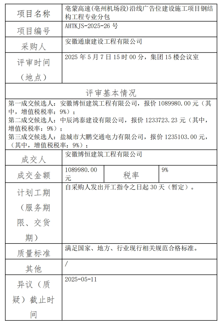 亳蒙高速(亳州機(jī)場段)沿線廣告位建設(shè)施工項(xiàng)目鋼結(jié)構(gòu)工程專業(yè)分包成交結(jié)果公示