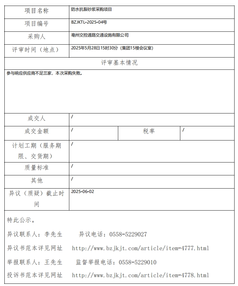 防水抗裂砂漿采購(gòu)項(xiàng)目成交結(jié)果公示