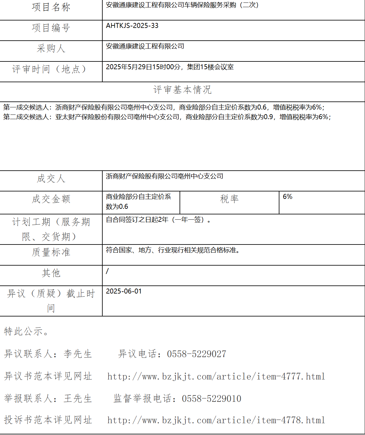 安徽通康建設(shè)工程有限公司車輛保險服務(wù)采購(二次)成交結(jié)果公示