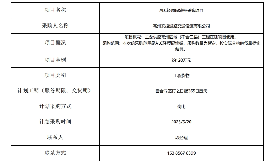 ALC輕質(zhì)隔墻板采購項目采購計劃