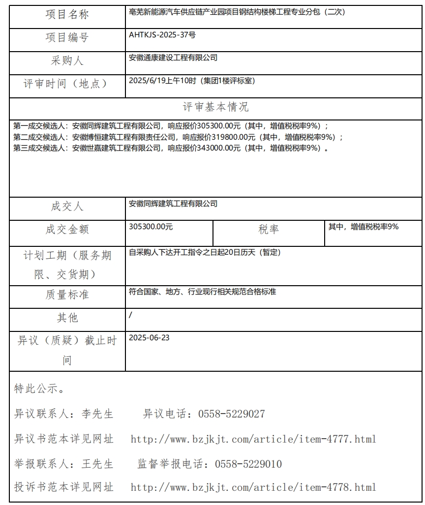 亳蕪新能源汽車供應(yīng)鏈產(chǎn)業(yè)園項(xiàng)目鋼結(jié)構(gòu)樓梯工程專業(yè)分包(二次)成交結(jié)果公示