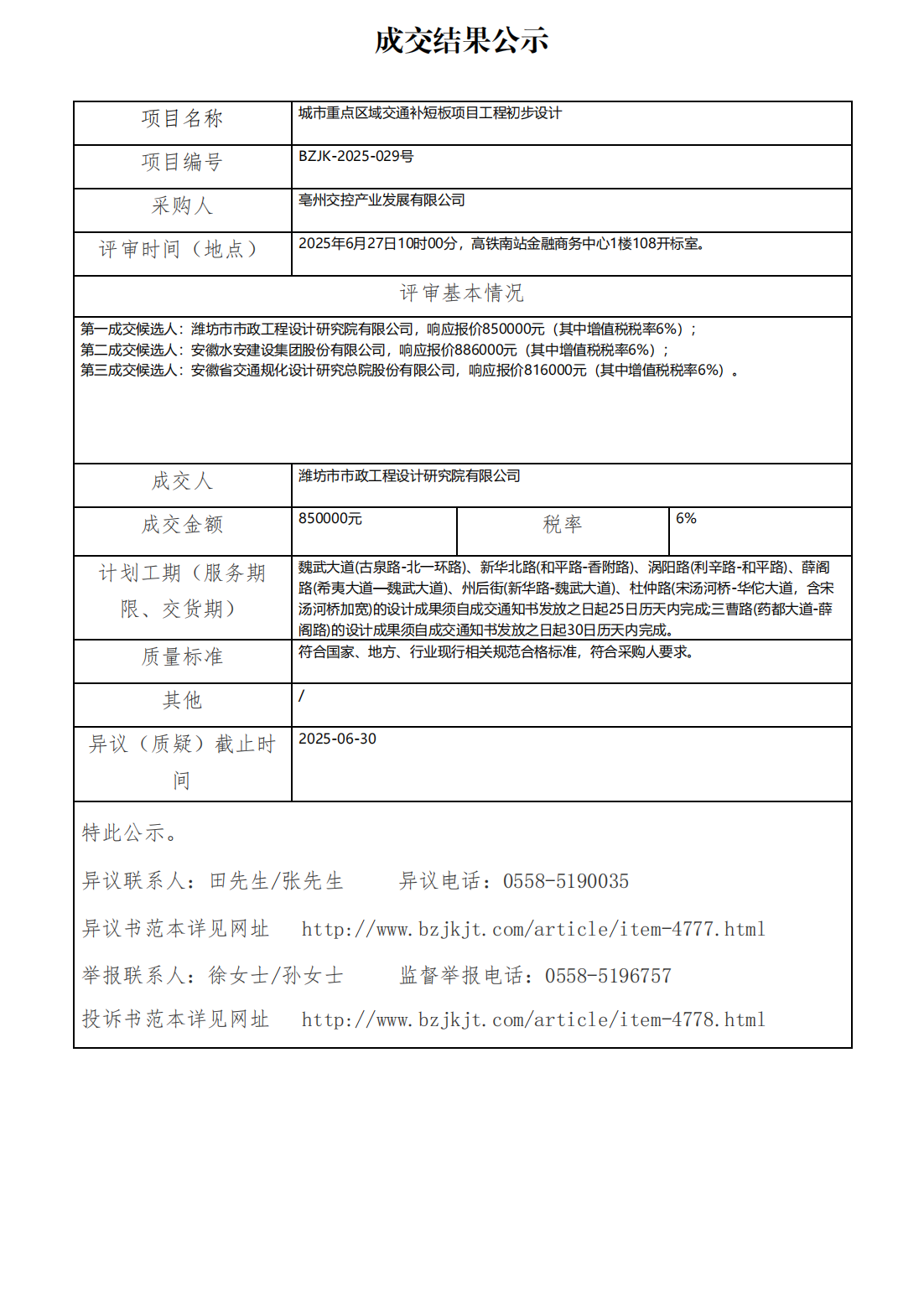 城市重點區(qū)域交通補短板項目工程初步設計成交結果公示