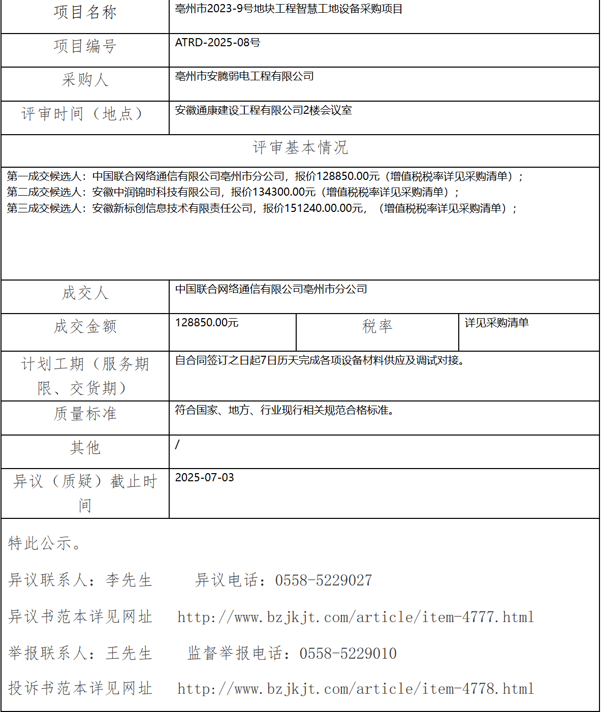 亳州市2023-9號(hào)地塊工程智慧工地設(shè)備采購(gòu)項(xiàng)目成交結(jié)果公示