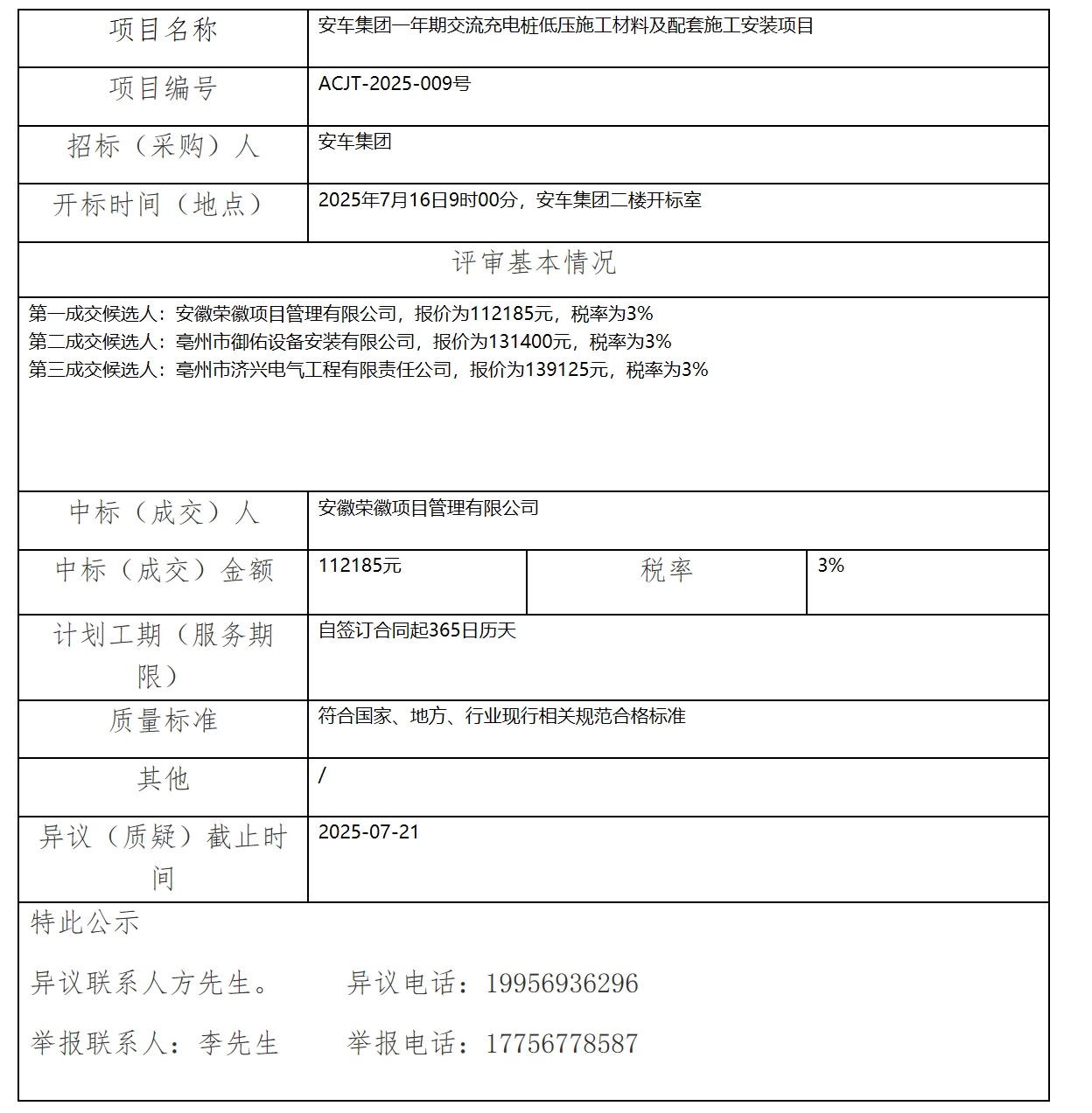 安車集團一年期交流充電樁低壓施工材料及配套施工安裝項目中標(成交)結(jié)果公示