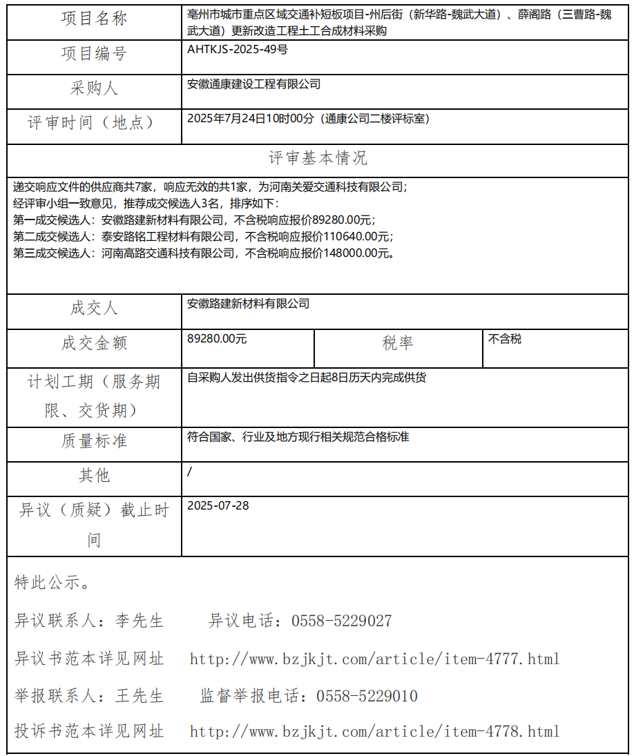 亳州市城市重點區(qū)域交通補短板項目-州后街(新華路-魏武大道)、薛閣路(三曹路-魏 武大道)更新改造工程土工合成材料采購成交結(jié)果公示