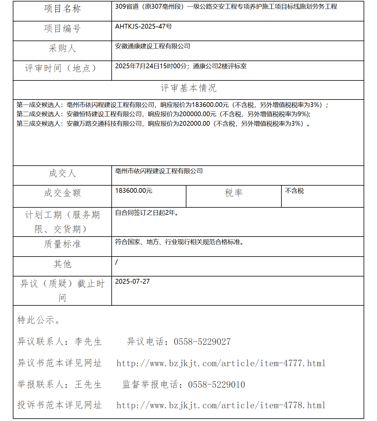 309省道(原307亳州段)一級(jí)公路交安工程專項(xiàng)養(yǎng)護(hù)施工項(xiàng)目標(biāo)線施劃勞務(wù)工程成交結(jié)果公示