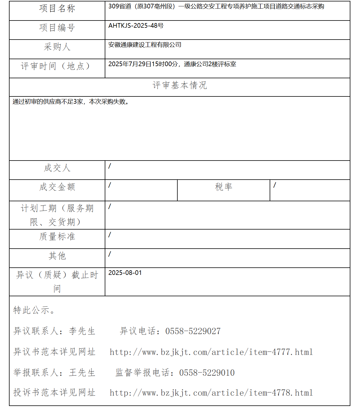 309 省道(原307亳州段)一級(jí)公路交安工程專項(xiàng)養(yǎng) 護(hù)施工項(xiàng)目道路交通標(biāo)志采購(gòu)成交結(jié)果公示