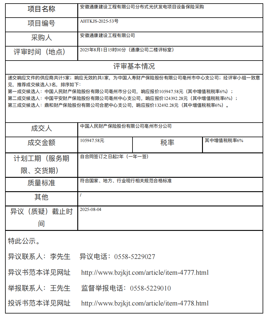 安徽通康建設(shè)?程有限公司分布式光伏發(fā)電項(xiàng)?設(shè)備保險(xiǎn)采購成交結(jié)果公示
