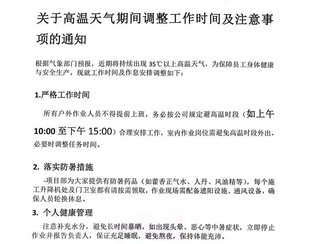 嚴(yán)格落實(shí)高溫天氣施工安全各項要求,指導(dǎo)各項目科學(xué)調(diào)整作業(yè)時間,全面推行“抓兩頭、歇中間”模式,剛性執(zhí)行高溫時段室外停工規(guī)定,嚴(yán)禁盲目搶趕工期,合理安排工序銜接,強(qiáng)化施工計劃管理,確保生產(chǎn)安全、有序推進(jìn)。