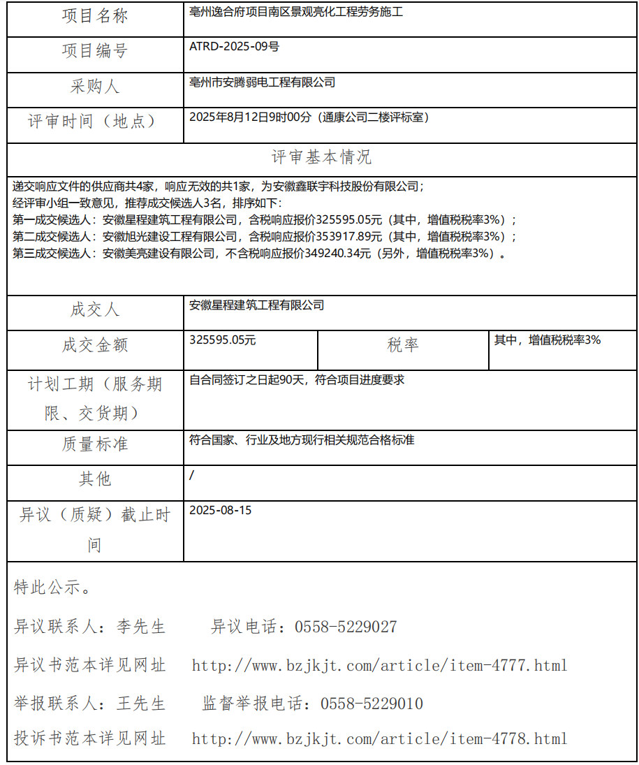亳州逸合府項(xiàng)目南區(qū)景觀(guān)亮化工程勞務(wù)施工成交結(jié)果公示