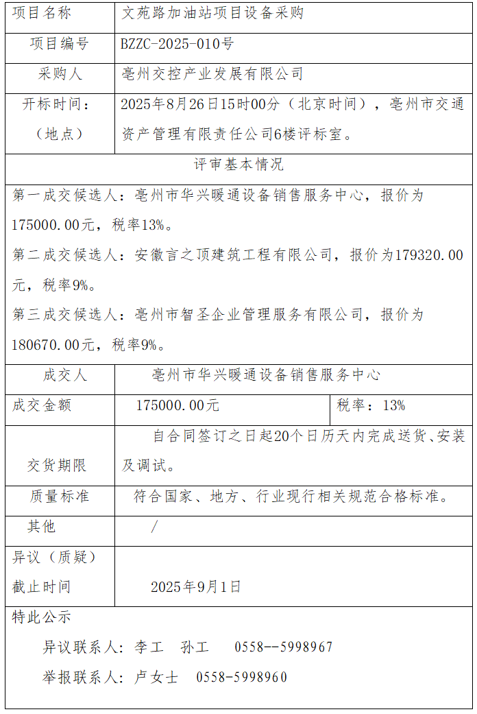 文苑路加油站項(xiàng)目設(shè)備采購成交結(jié)果公示