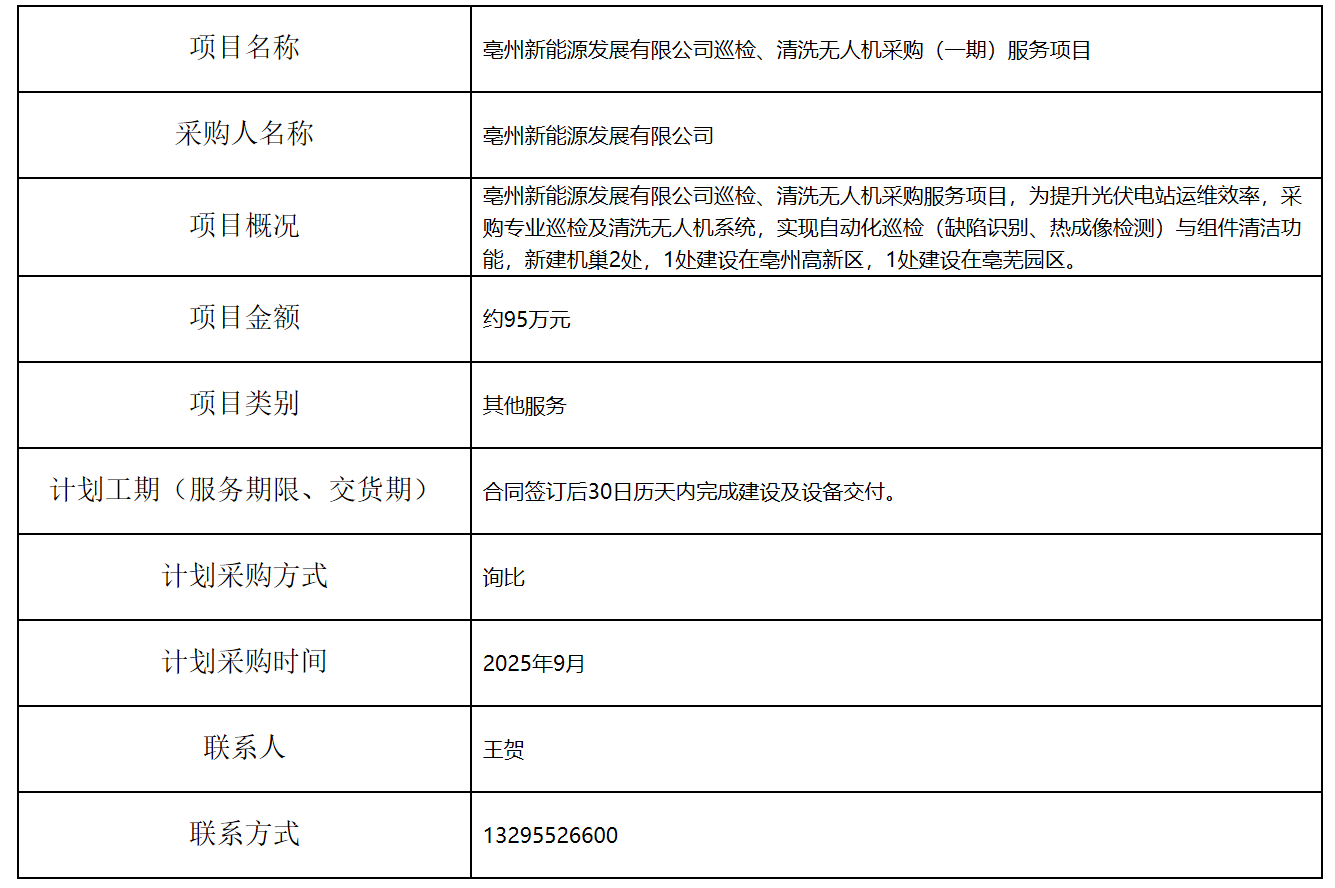亳州新能源發(fā)展有限公司巡檢、清洗無人機(jī)采購(一期)服務(wù)項(xiàng)目招標(biāo)計(jì)劃