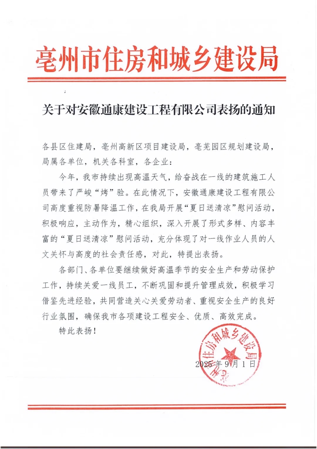近日,通康公司收到了亳州市住房和城鄉(xiāng)建設(shè)局發(fā)來的表揚文件,文件對通康公司在防暑降溫、安全生產(chǎn)、保障勞動者安全健康等方面表示了充分肯定,為全市建筑行業(yè)樹立了優(yōu)秀典范。