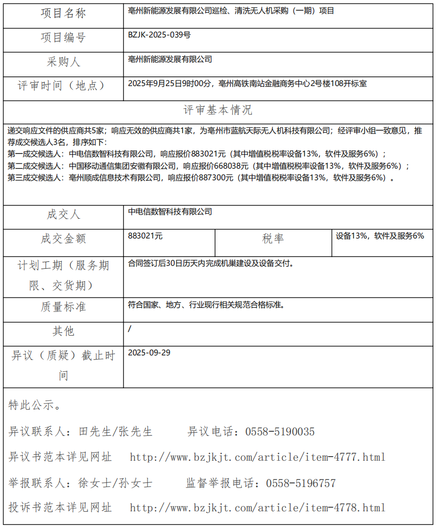 亳州新能源發(fā)展有限公司巡檢、清洗無(wú)人機(jī)采購(gòu)(一期)項(xiàng)目成交結(jié)果公示