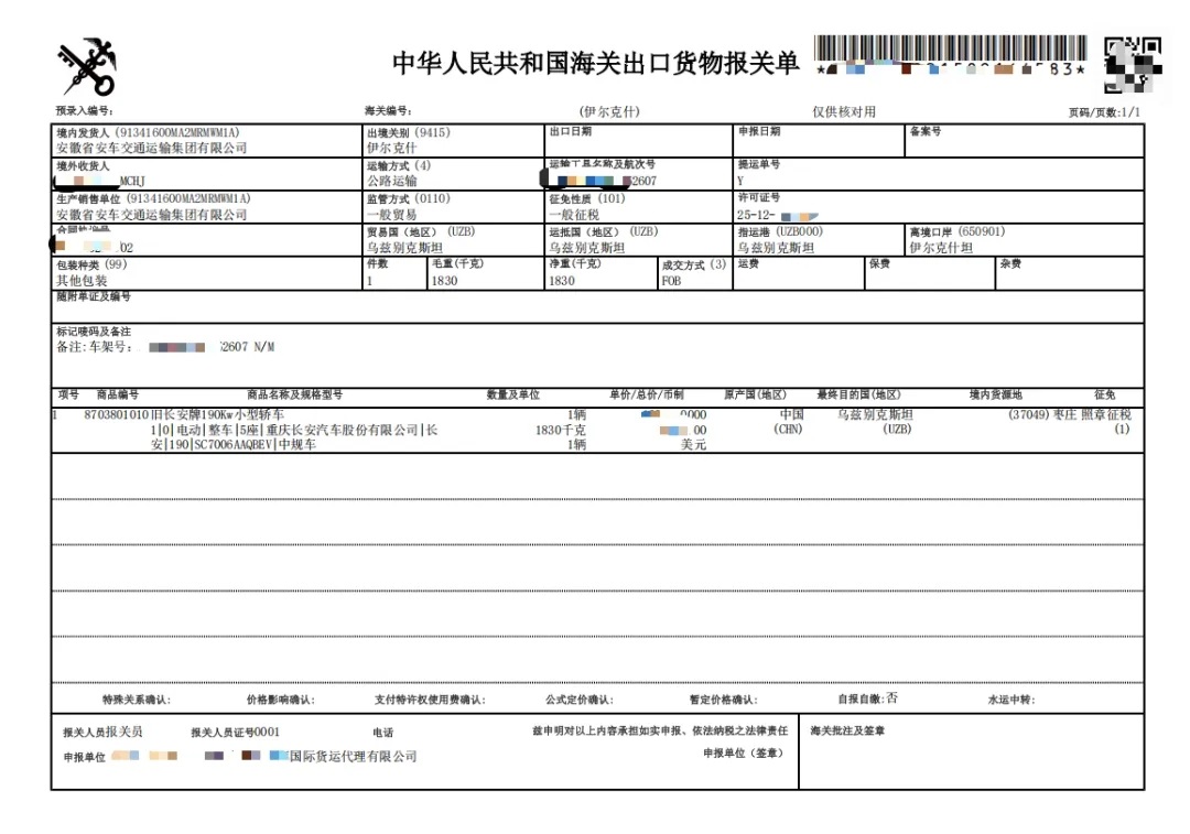 本次出口車輛為長安牌深藍(lán)SL03,經(jīng)過嚴(yán)格的檢測、整備與認(rèn)證,全面符合出口目的國的相關(guān)標(biāo)準(zhǔn)和要求。9月8日,安車集團(tuán)成功獲取首臺二手車出口許可證,為車輛出海按下“加速鍵”。車輛于9月27日完成全部報關(guān)流程,經(jīng)公路運輸從伊爾克什口岸發(fā)往烏茲別克斯坦,最終交付海外客戶。