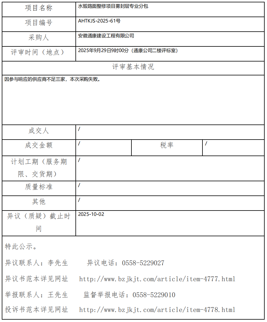水毀路面整修項(xiàng)目霧封層專業(yè)分包成交結(jié)果公示