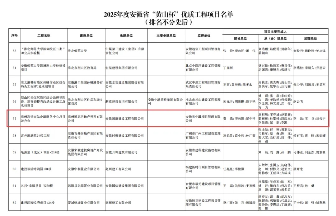 近日,安徽省住房和城鄉(xiāng)建設(shè)廳公示了2025年度安徽省建設(shè)工程“黃山杯”獎(省優(yōu)質(zhì)工程)項目名單,由通康公司承建的亳州高鐵南站商務(wù)中心項目2#樓成功榮獲2025年度安徽省建設(shè)工程“黃山杯”獎。