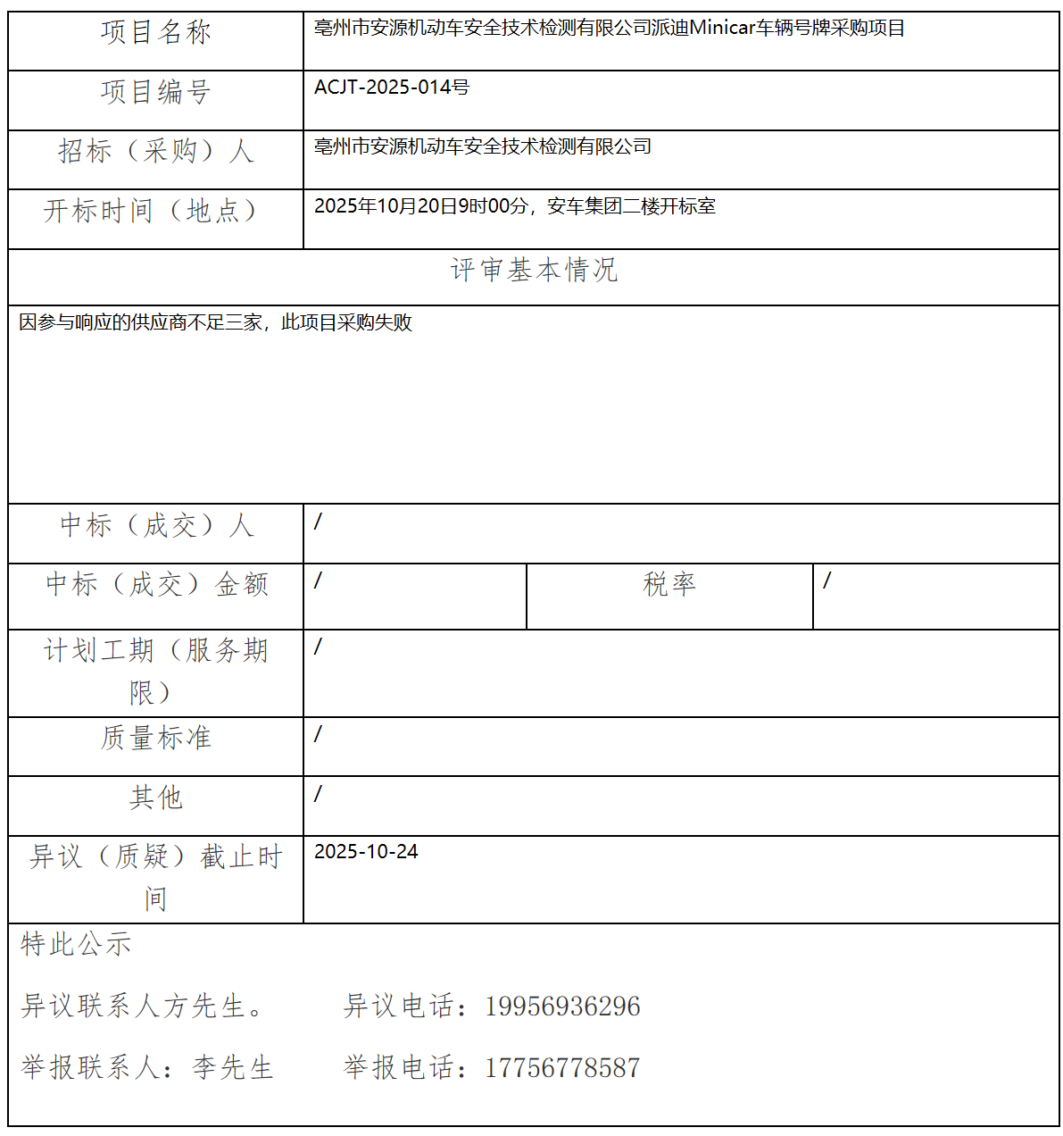 亳州市安源機(jī)動(dòng)車安全技術(shù)檢測(cè)有限公司派迪Minicar車輛號(hào)牌采購項(xiàng)目中標(biāo)(成交)結(jié)果公示
