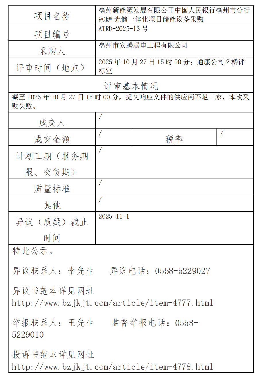 亳州新能源發(fā)展有限公司中國(guó)人民銀行亳州市分行90kw光儲(chǔ)一體化項(xiàng)目?jī)?chǔ)能設(shè)備采購(gòu)成交結(jié)果公示