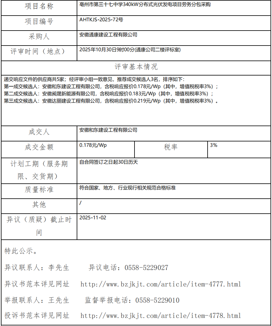亳州市第三十七中學340kW分布式光伏發(fā)電項目勞務分包采購成交結果公示