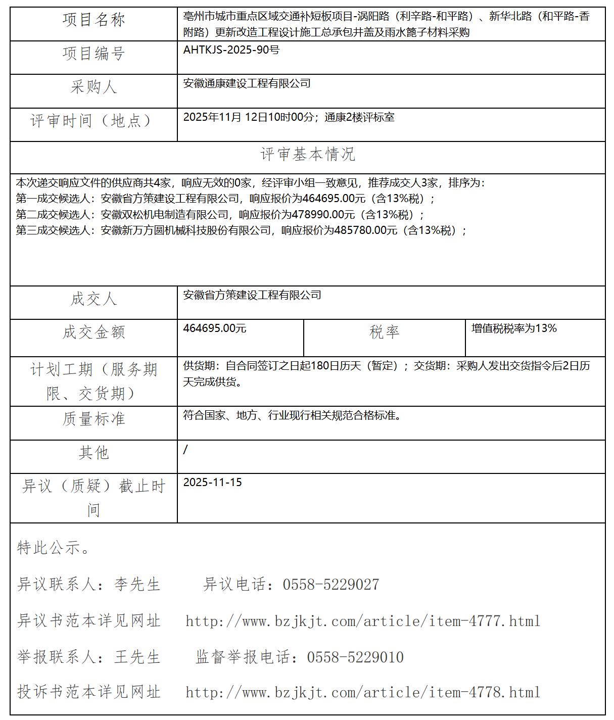 亳州市城市重點區(qū)域交通補短板項目-渦陽路(利辛路-和平路)、新華北路(和平路-香附路)更新改造工程設(shè)計施工總承包井蓋及雨水篦子材料采購成交結(jié)果公示