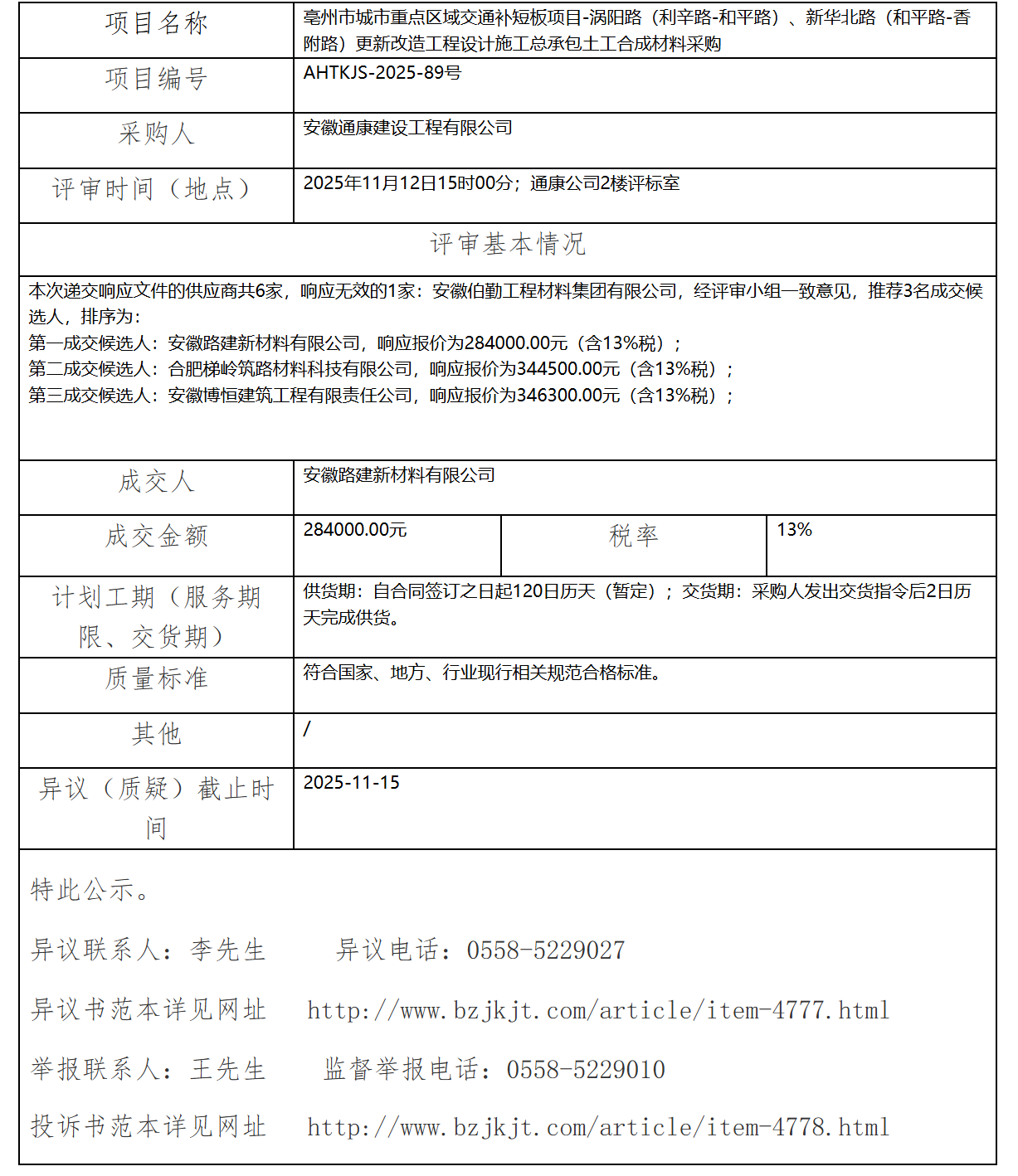 亳州市城市重點區(qū)域交通補短板項目-渦陽路(利辛路-和平路)、新華北路(和平路-香附路)更新改造工程設(shè)計施工總承包土工合成材料采購成交結(jié)果公示