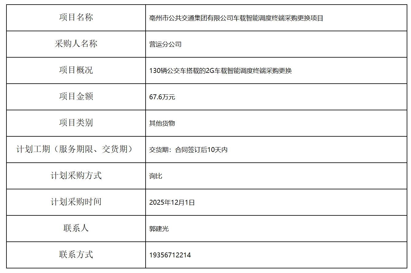 亳州市公共交通集團(tuán)有限公司車(chē)載智能調(diào)度終端采購(gòu)更換項(xiàng)目采購(gòu)計(jì)劃
