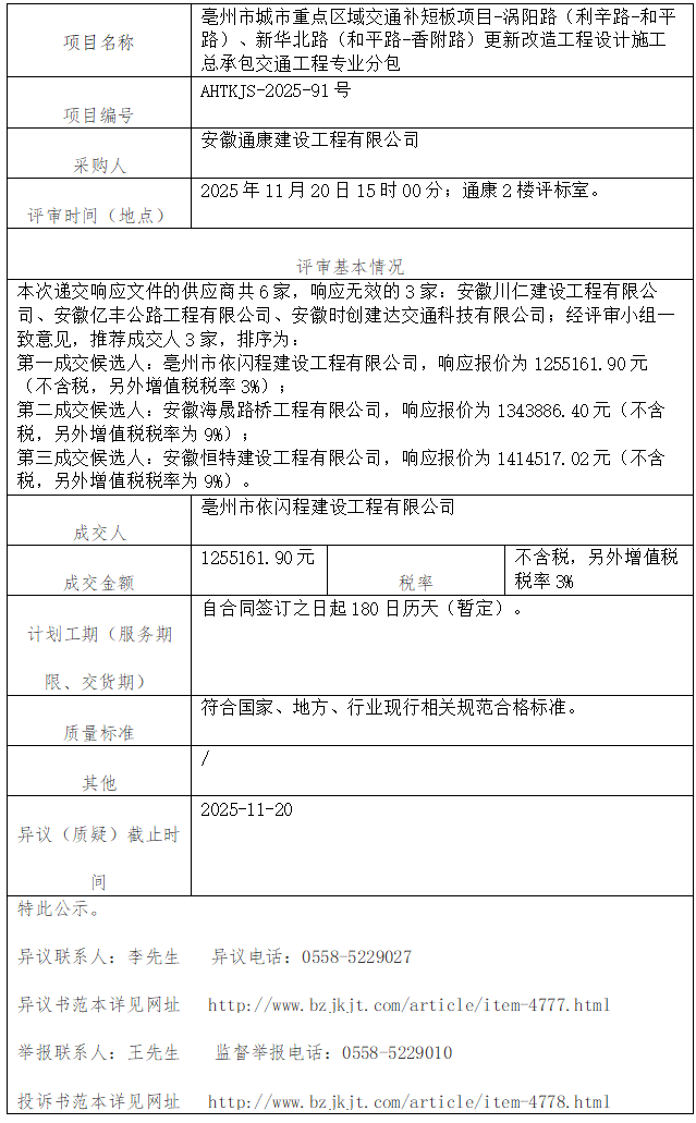 亳州市城市重點(diǎn)區(qū)域交通補(bǔ)短板項(xiàng)目-渦陽(yáng)路(利辛路-和平路)、新華北路(和平路-香附路)更新改造工程設(shè)計(jì)施工總承包交通工程專業(yè)分包成交結(jié)果公示
