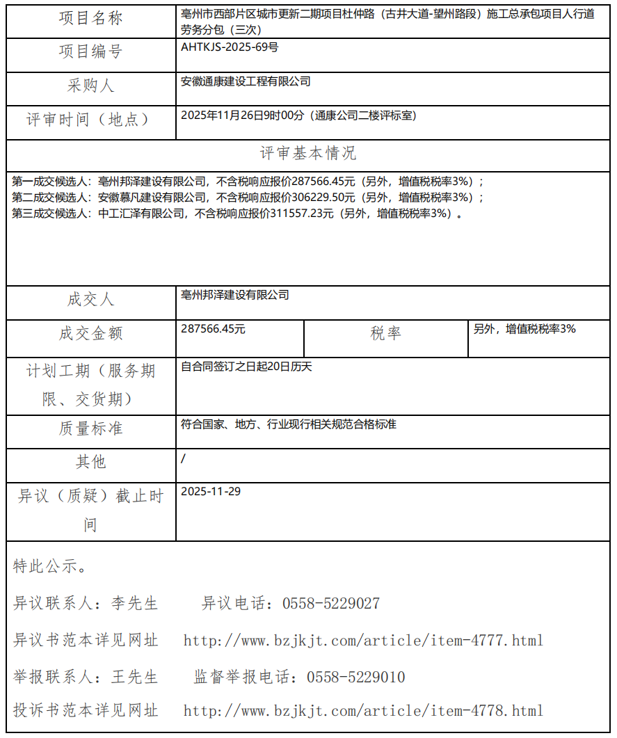 亳州市西部片區(qū)城市更新二期項目杜仲路(古井大道-望州路段)施工總承包項目人行道勞務(wù)分包(三次)成交結(jié)果公示