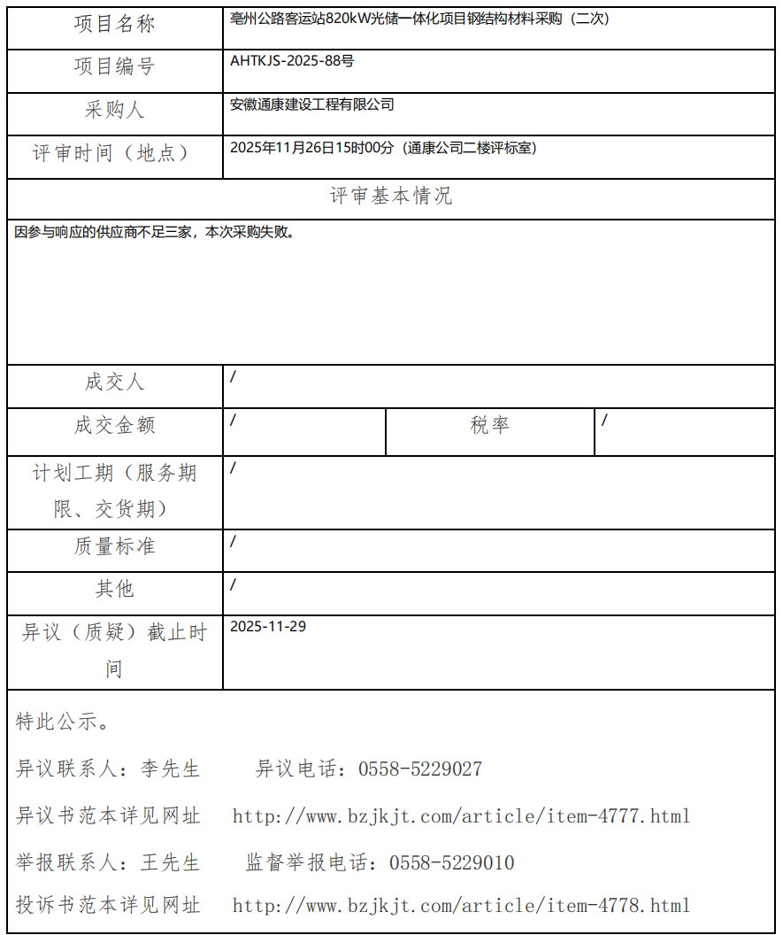 亳州公路客運站820kW光儲一體化項目鋼結(jié)構(gòu)材料采購(二次)成交結(jié)果公示