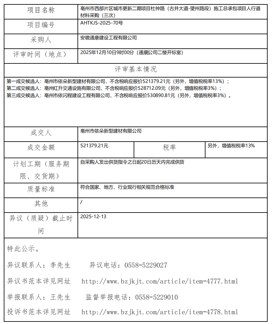 亳州市西部片區(qū)城市更新二期項目杜仲路(古井大道-望州路段)施工總承包項目人行道 材料采購(三次)成交結(jié)果公示