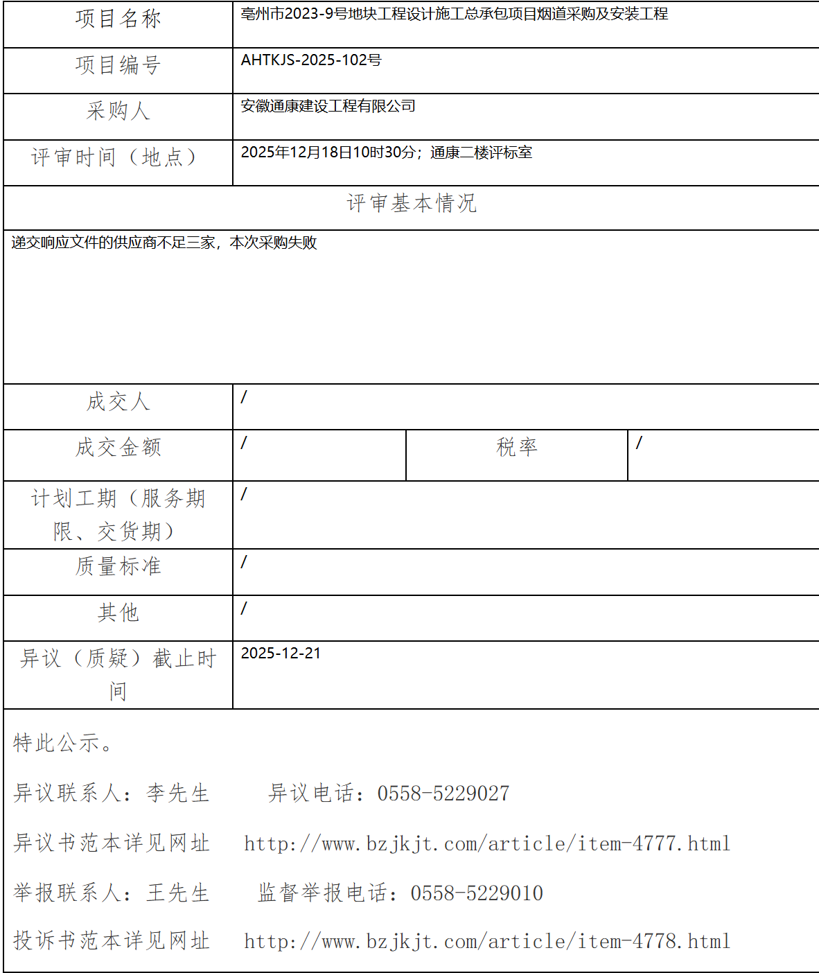 亳州市2023-9號(hào)地塊工程設(shè)計(jì)施工總承包項(xiàng)目煙道采購(gòu)及安裝工程成交結(jié)果公示
