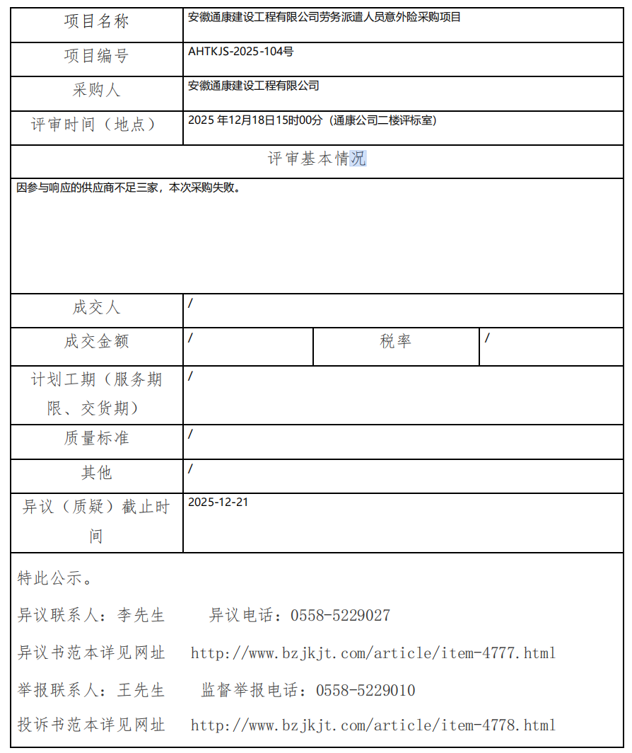 安徽通康建設(shè)工程有限公司勞務(wù)派遣人員意外險采購項目成交結(jié)果公示