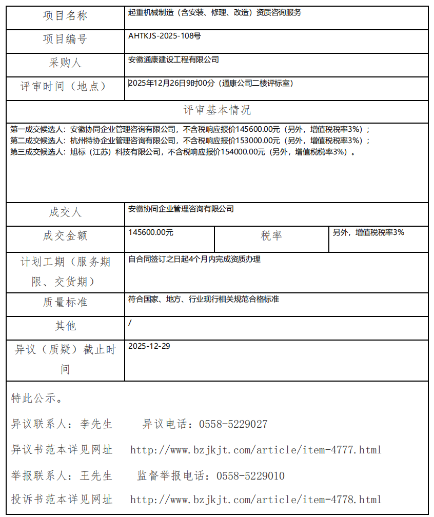 起重機(jī)械制造(含安裝、修理、改造)資質(zhì)咨詢服務(wù)成交結(jié)果公示