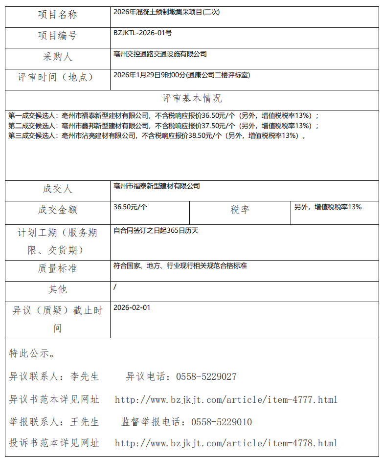 2026年混凝土預(yù)制墩集采項(xiàng)目(二次)成交結(jié)果公示