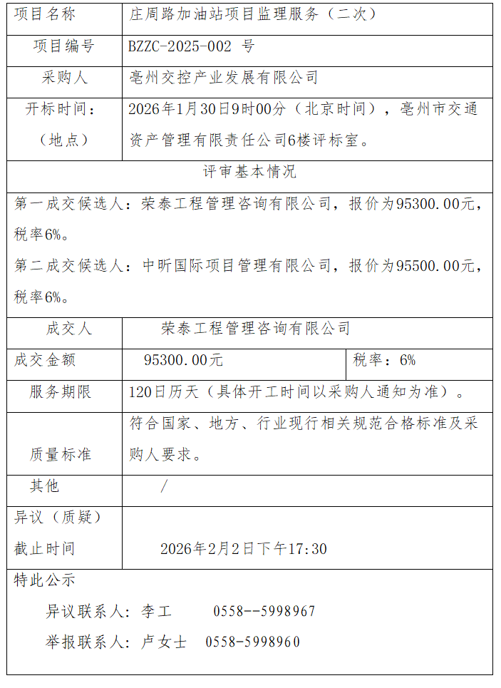 莊周路加油站項(xiàng)目監(jiān)理服務(wù)(二次)成交結(jié)果公示