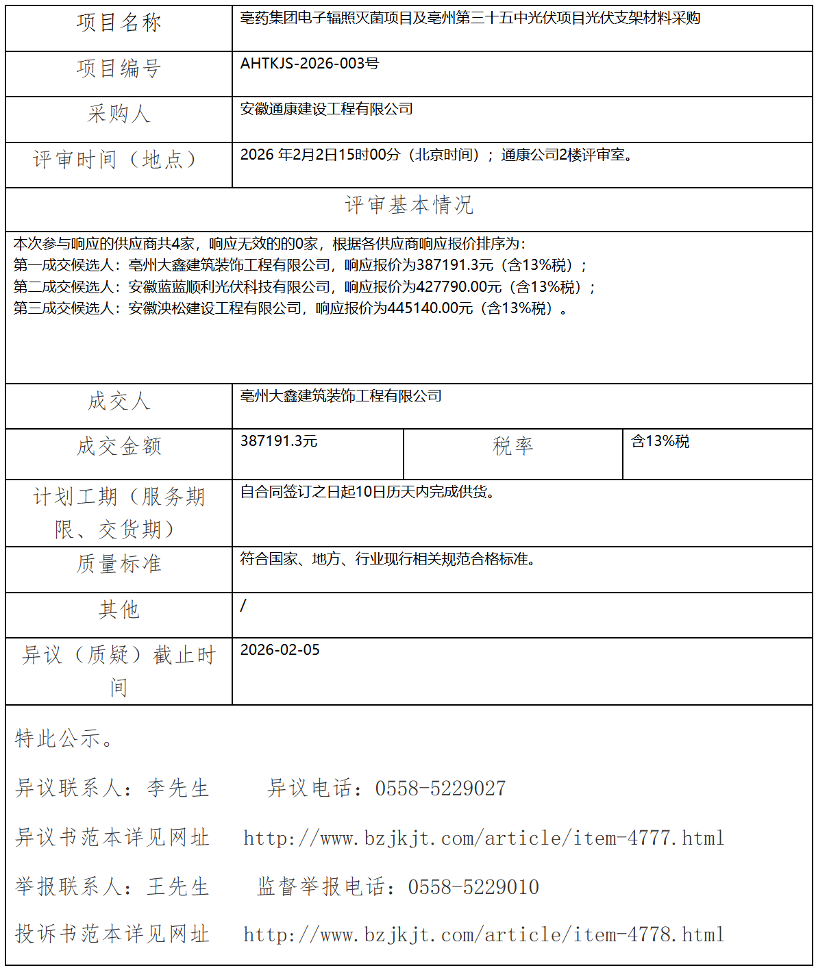 亳藥集團電子輻照滅菌項目及亳州第三十五中光伏項 目光伏支架材料采購成交結(jié)果公示