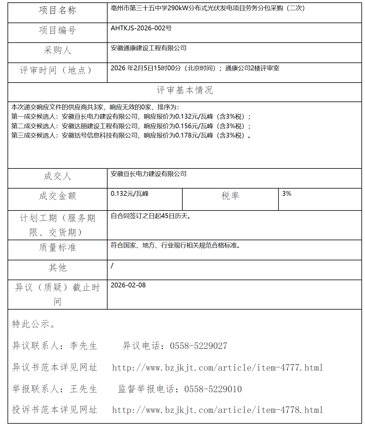 亳州市第三十五中學(xué)290kW分布式光伏發(fā)電項(xiàng)目勞務(wù)分包采購(gòu)(二次)成交結(jié)果公示
