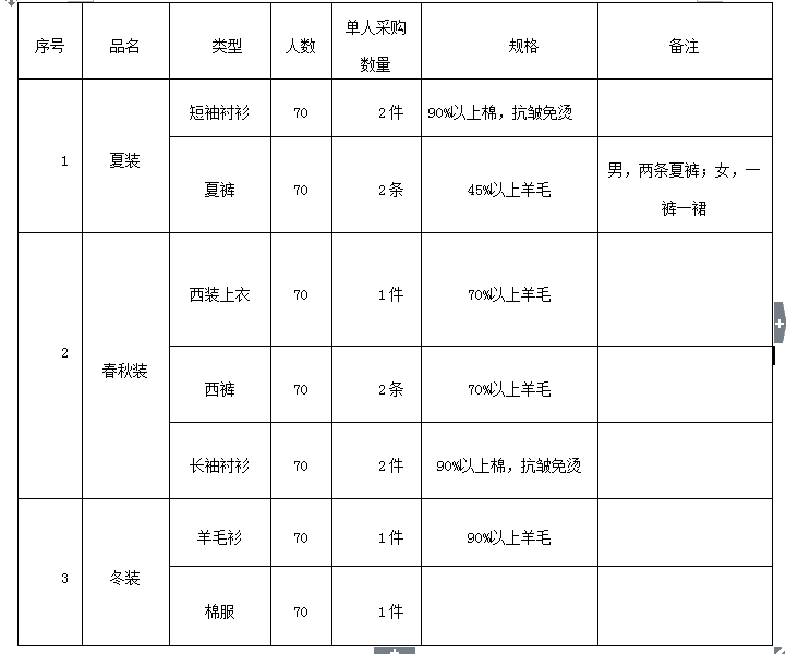 四、人員范圍:配置工作服的人員為集團(tuán)公司在崗的全體員工,約70人。(以實(shí)際采購(gòu)數(shù)量為準(zhǔn))