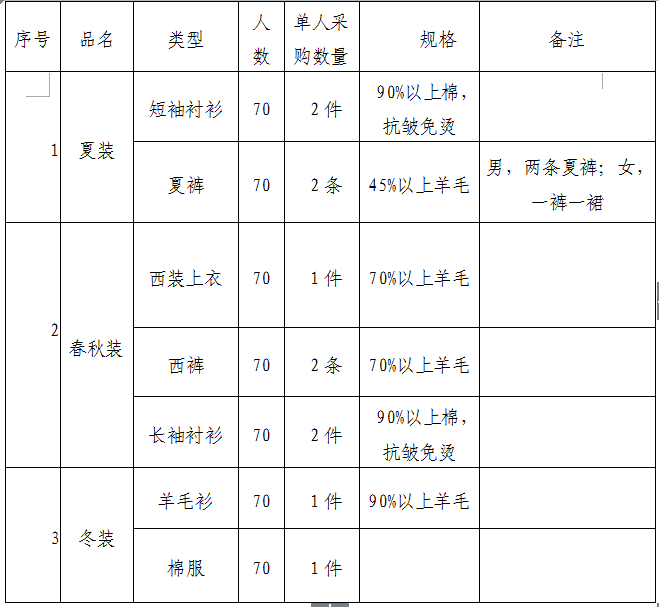 四、人員范圍:配置工作服的人員為集團(tuán)公司在崗的全體員工,約70人。(以實(shí)際采購(gòu)數(shù)量為準(zhǔn))