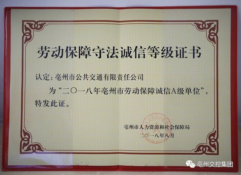 11月28日,市人社局召開亳州市2018年度勞動(dòng)保障書面審查及誠信評價(jià)表彰會(huì),公交公司被授予“亳州市勞動(dòng)保障守法誠信A級單位”榮譽(yù)稱號。