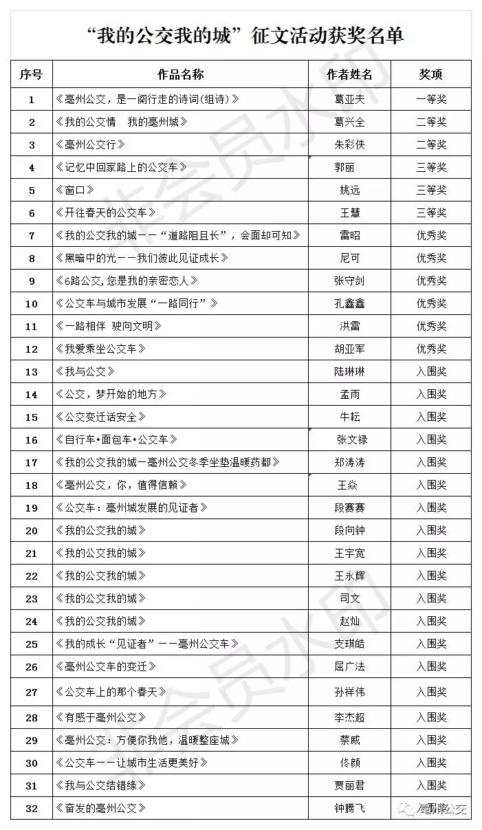 恭喜以上獲獎(jiǎng)作品,請(qǐng)獲獎(jiǎng)作品的作者前往譙城區(qū)1289號(hào)市交通運(yùn)輸局旁交通綜合大樓4樓領(lǐng)取公交卡,聯(lián)系人:王部長(zhǎng) 18956888074。