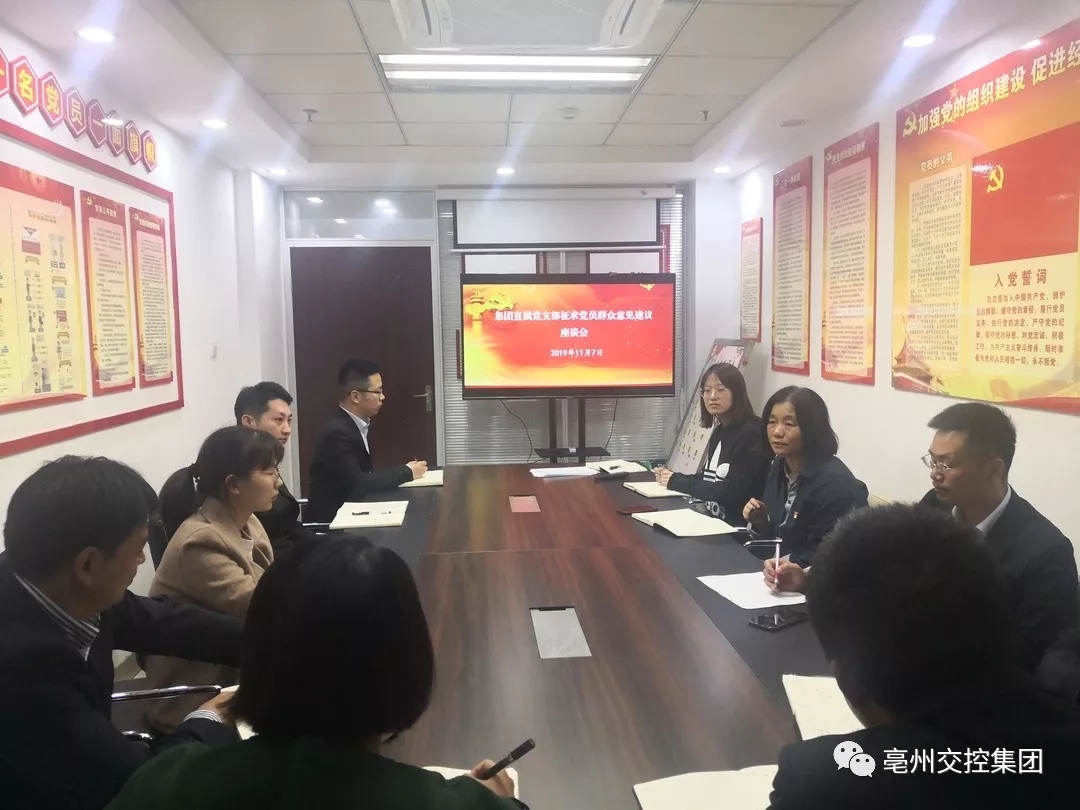 ??11月7日,集團直屬黨支部召開“不忘初心、牢記使命”主題教育征求意見座談會,面對面聽取黨員群眾對支委班子、支委成員和身邊黨員的意見建議,深入檢視問題,推動整改落實。
