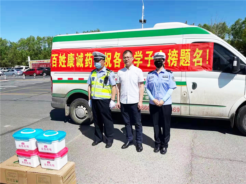 2021年6月百姓康誠藥房攜手大慶交通廣播到實(shí)驗(yàn)中學(xué)考點(diǎn)助力高考,為交警同志帶來飲用水和應(yīng)急藥品